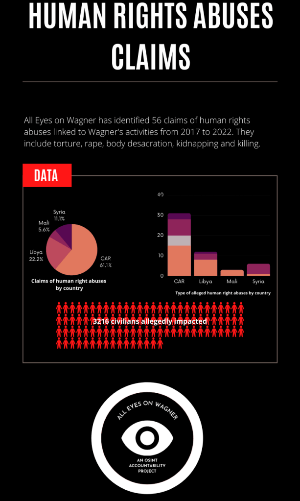Using open sources, the All Eyes On Wagner team has compiled a list of 52 claims of human rights abuses related to Wagner’s activities from 2017 to 2022. The project team is now verifying them using open source research.