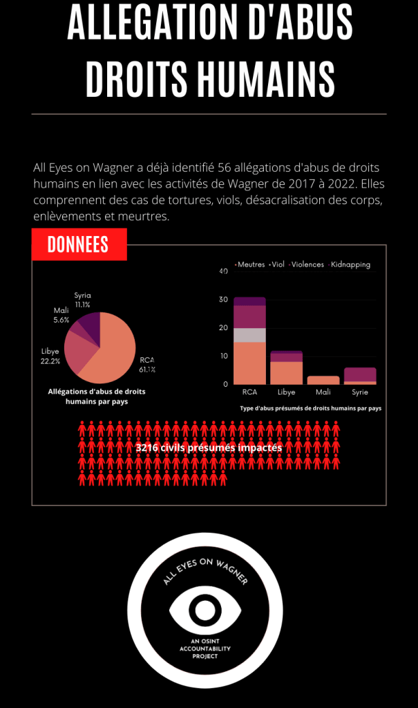 À l’aide de sources ouvertes, l’équipe All Eyes On Wagner a compilé une liste de 52 allégations de violations des droits de l’homme liées aux activités de Wagner de 2017 à 2022. L’équipe du projet les vérifie actuellement à l’aide de recherches open source.