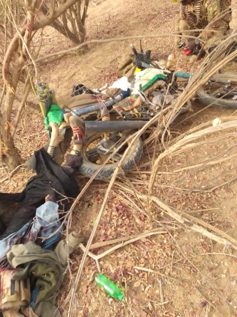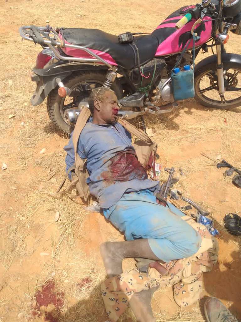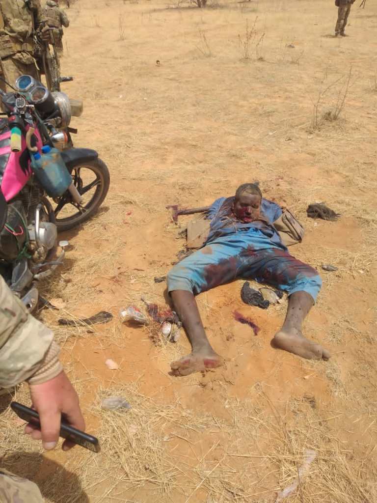 The four images below show the bodies of two men allegedly killed in an armed clash with FAMa soldiers, accompanied by at least one unidentifiable Caucasian man in camouflage uniforms. The elements visible in the photos (clothing, outfit, vehicles of the dead) and the information gathered suggest that the two men killed were fighters from the JNIM (“Jama’a Nusrat ul-Islam wa al-Muslimi”, a jihadist coalition affiliated with al-Qaeda), who were travelling on two motorcycles at the time of the confrontation.