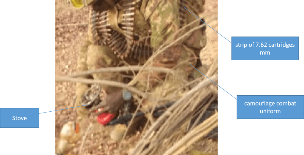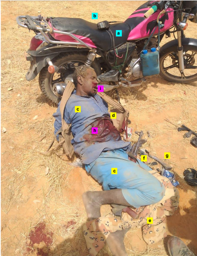 The image shows the body of a deceased young looking Black male (which will be referred to as “dead body 1”), resting on his back. The man is dressed and equipped in classic JNIM fighter uniform. We note: a characteristic black turban (a), a blue tunic (b), a khaki lined jacket (c), a combat harness in sand colour for AK (d) assault rifle munitions and next to the body a pair of protective glasses (e). The man appears to have suffered a wound with massive bleeding in the level of the abdomen (.f.), possibly by gunshot, which may have resulted in death. Around the body, we note also on his left a sand-coloured satchel apparently containing a small canister (g) and above his head small first aid items (two pairs of surgical scissors, tablets, a plastic syringe, various compresses) (h), which may suggest that a first aid kit has been opened.