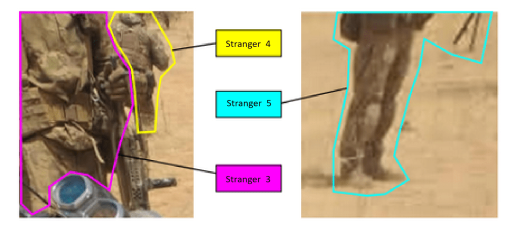 At the bottom left of the image, we note in close-up the hand of a Caucasian type man (designated as “Unknown 2”), we are coming back to it in the following section. Finally, three other individuals are visible in the image: