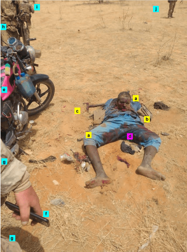 The image shows the same body as in Photo 1, identifiable by his black turban (a), his blue tunic (b), his khaki lined jacket (c) and his sand combat harness (d), elements already visible in image 1. The body seems to have been photographed from another angle, without having been moved between frame 1 and frame 2. Dead body 1 is wearing only one shoe on his right foot (e). At the feet of the body is a motorcycle probably 125 cc lying on its side on the ground (which will be designated as “motorcycle 1”) (f), common transport mode among combatants of armed groups in Mali. On motorcycle 1 there are pieces of equipment and various bivouac items, like a folded mat (g).