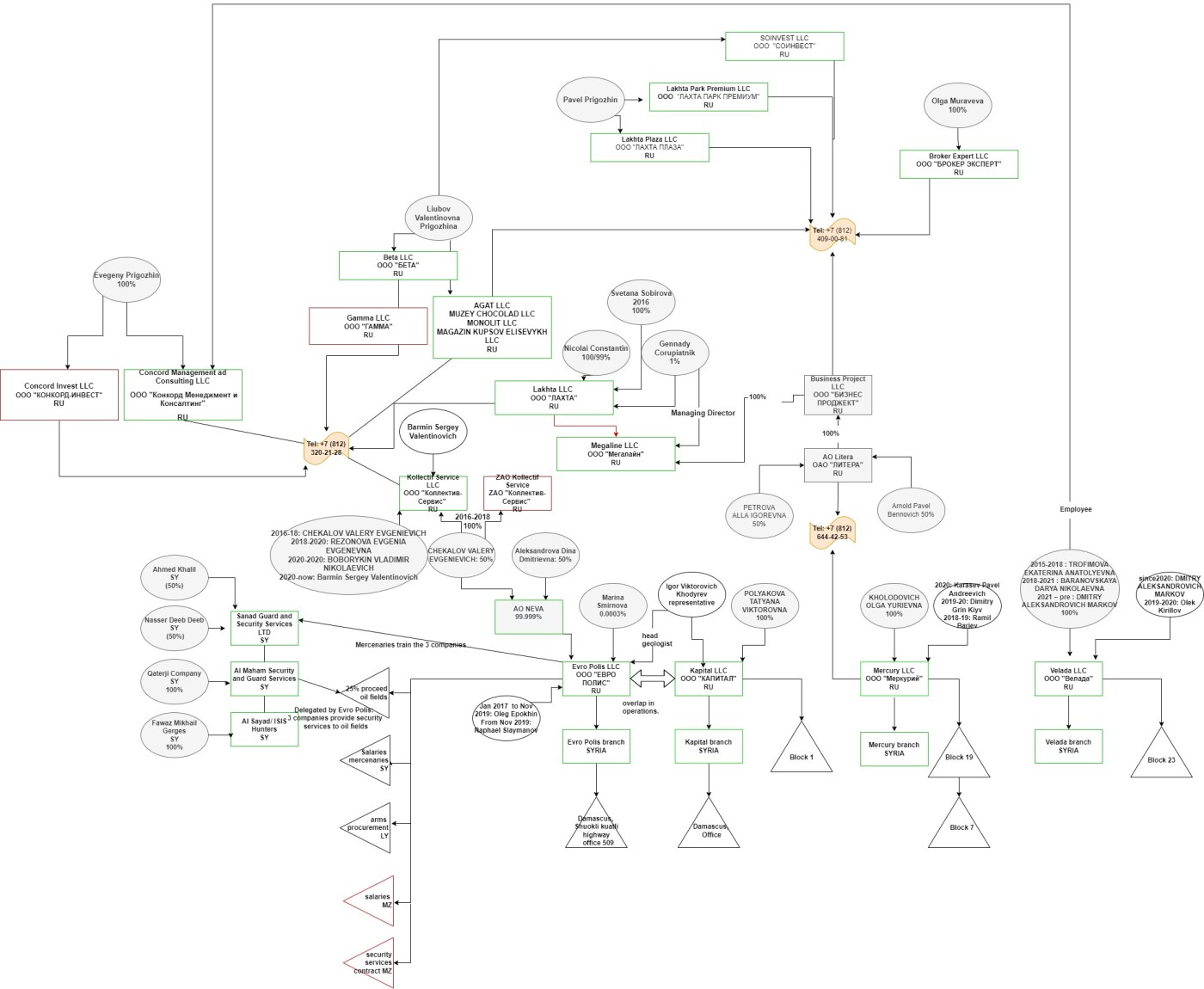 We looked using open sources only the activities of the Evgeny Prigozhin galaxy in Syria since its start and came up with the following chart linking Prigozhin to oil and security businesses in Syria.