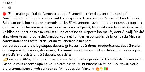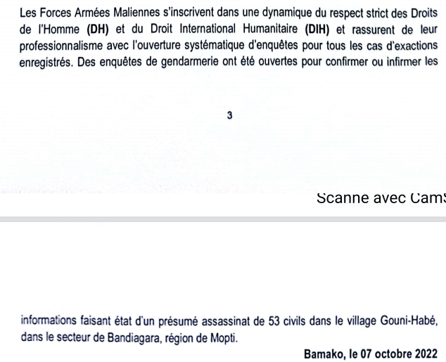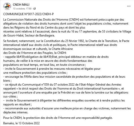 The press release is referred to by the Human Rights National Commission of Mali in a communication congratulating the FAMA for diligenting an investigation to the killing of 53 civilians in Gouni-Habé village.