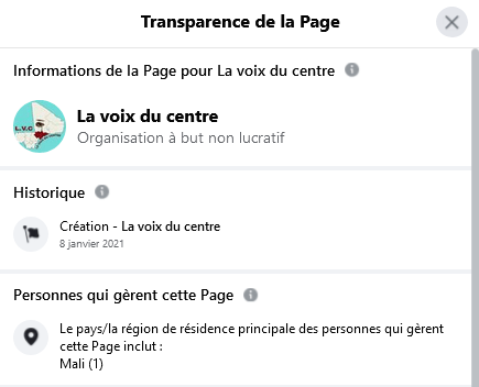 The two Facebook accounts are rather recent: la Voix du Centre with 1.2k followers was created on January 8th 2021 and Commandant Methè Media with 10k followers was created on February 14th 2021.