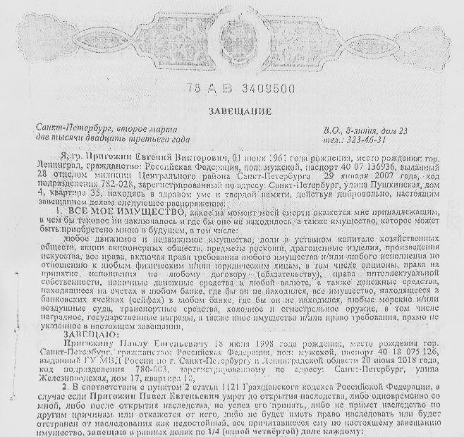 Le 30 Septembre 2023 un compte Telegram dont il est difficile d’évaluer la probité publie un morceau de document présenté comme le testament de Prigojine dans lequel il lègue l’ensemble de ses biens et sociétés à son fils Pavel Prigojine. Evgeny Prigojine est alors actionnaire direct de cinq sociétés qui forment le haut de la holding Concord.