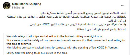 Le HOCC a entrepris un travail de lobbying et de harcèlement en contactant les acteurs du secteur maritime: armateurs, compagnies d’assurance, organisations maritimes,navires pour les informer de l’interdiction de naviguer pour certains navires et rassurer les acteurs que les navires hors critères d’interdiction de navigation ne seront pas sujets des attaques des Houthis. Mais sans réponse, le HOCC commencerait à harceler.