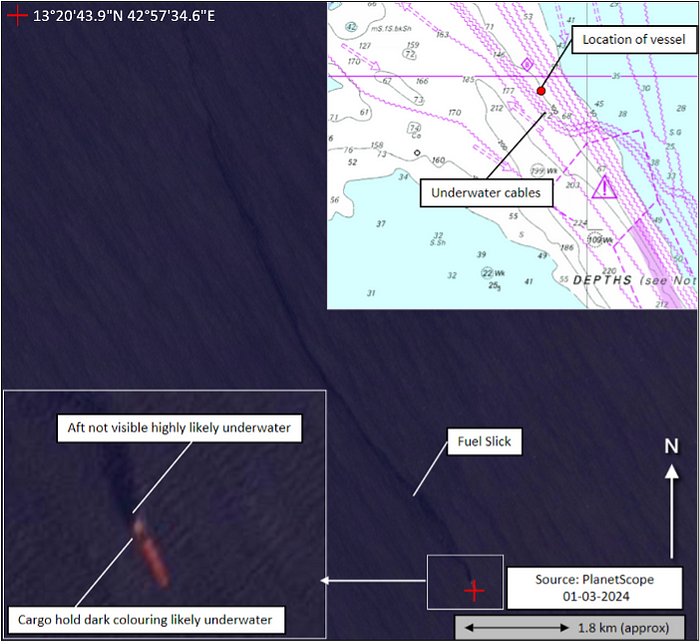 Mais les attaques des Houthis ont aussi eu indirectement des conséquences sur l’infrastructure des câbles sous-marins qui transitent dans la zone. Le 18 février 2024, le navire RUBYMAR (IMO: 9138898) sous pavillon de Bélize est touché par une attaque Houthi alors qu’il navigue en Mer Rouge. Alors qu’il dérive pendant plusieurs jours, son ancre aurait probablement endommagé les câbles sous-marins à proximité entraînant un arrêt des connexions.