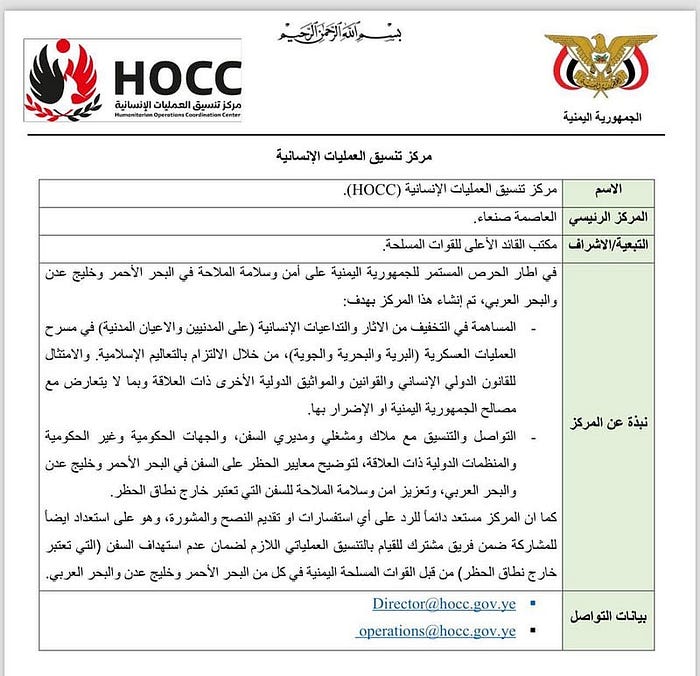 Le décret décrit les objectifs et missions du HOCC. Le centre a en effet pour objectif officiel de contribuer à “atténuer les effets et les répercussions humanitaires (sur les civils et les biens de caractère civil) sur le théâtre des opérations militaires (terrestre, maritime et aérienne) par l’adhésion aux enseignements islamiques et le respect du droit international humanitaire et d’autres règles pertinentes”. Les missions affichées du HOCC sont donc la communication et coordination en interne et en externe avec toutes les parties, les agences gouvernementales et non gouvernementales et les organisations internationales compétentes pour faire respecter l’interdiction de navigation. Le HOCC revendique une mission de sécurité maritime selon ses termes. Le mouvement armé sanctionné impose lui-même ses propres sanctions.