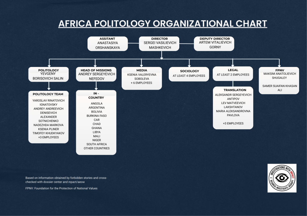 Our investigation suggests a hierarchal organization led by Sergey Mashkevich, supported by an assistant. Gornyi serves as a deputy director, with Nefedov overseeing international missions. Mashkevich coordinates seven distinct operational desks: political sciences and public affairs, media and digital, analysis, sociology, legal, translation, and a separate entity hosting the Foundation for the Protection of National Values, which is directed by Maxim Shugaley.
