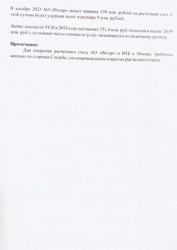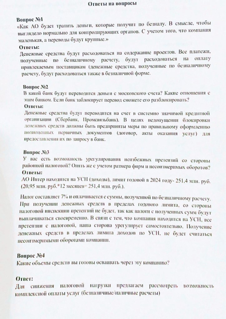 The questions mention JSC Inter, a company used by Africa Politology to receive money transferred by the SVR. The objective of the preparatory questionnaire is to ensure that the company will behave according to Russian regulations and within the limits of the fiscal regime it is registered under. It cannot receive more than 251 million rubles per year (3,268,800 USD) or 20.9 million rubles monthly (0.27 million USD). The money received will be used solely to pay suppliers or get cash. Africa Politology suggests also payments for service in cash to avoid scrutiny. On paper, JSC Inter is a small company benefiting from a simplified tax regime for its low reported turn-over. The SVR just has to facilitate the opening of a bank account.
