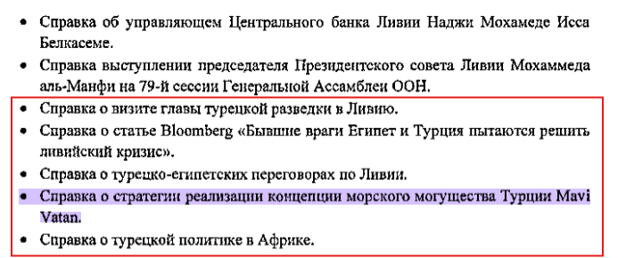 But the more intricate campaign unfolds in media briefs and “informational cases.” Among the proposals: “cultivate anti-Turkish sentiment among Libyan elites and the broader population”; “block Ankara’s military-political projects”; and, crucially, “form contradictions between NATO countries on the Libyan track (Turkey versus the USA).”