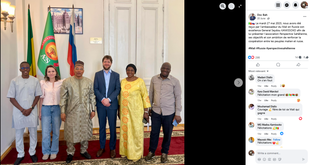 This enables other individuals and organisations to gravitate around him and the Russian House. According to sources and research, representatives of the Malian government like Oumar Diallo, the Prime Minister Chief of Staff, or Mariam Diarra Savané, Deputy Head of Parliament’s International Affairs Committee, are attending events at the Russian House. But also, Russian organisations closely related to the Russian security services like African Initiative and its spin-off the Perspective Sahelienne, headed by Malian blogger Mahmadou Bah, are present.
