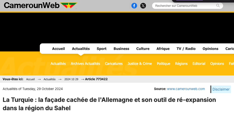 The website linked to the historical Prigozhin galaxy which keeps reappearing to support Africa Politology’s campaign is United World International. Located in Istanbul, the structure is controlled by the Gorev Foundation, a small foundation linked to Görev Vakfı, an industrial group with political ambitions and a pro-Russian positioning. UWI was placed under sanctions as its editor in chief was Darya Dugina at the time she was working for Evgeny Prigozhin. The website recycles campaigns aiming at stirring a rift between NATO members, especially Europe and Turkey or The US and Turkey, giving the impression that the information emanates from Turkish sources. The idea is to complicate Ankara’s alignment within NATO.