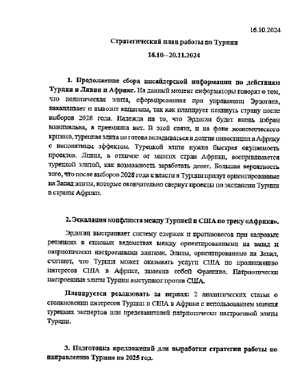 A strategic one-page memo dated October 2024 looks further ahead. It calls for intensified collection of insider information on Turkey’s activities in Libya and Africa, with particular attention to the internal balance of power in Ankara.