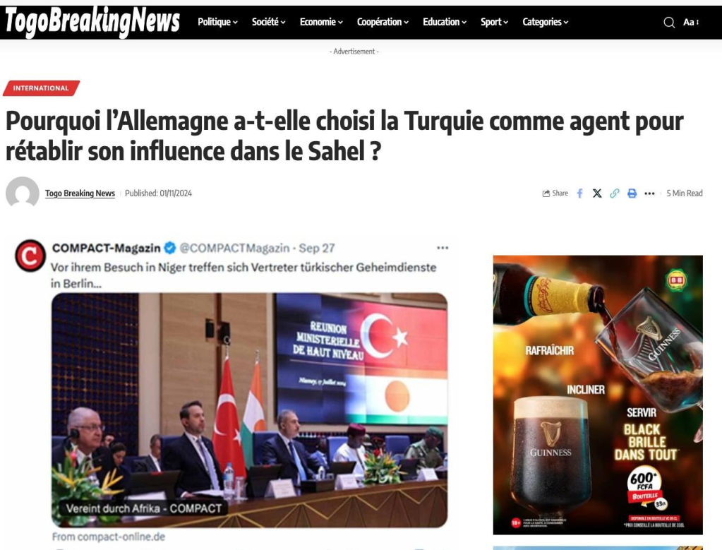 Parallel media placements in African outlets depict Turkey as a proxy for other Western powers, especially Germany — or as a destabilizing actor pursuing narrow economic gain.