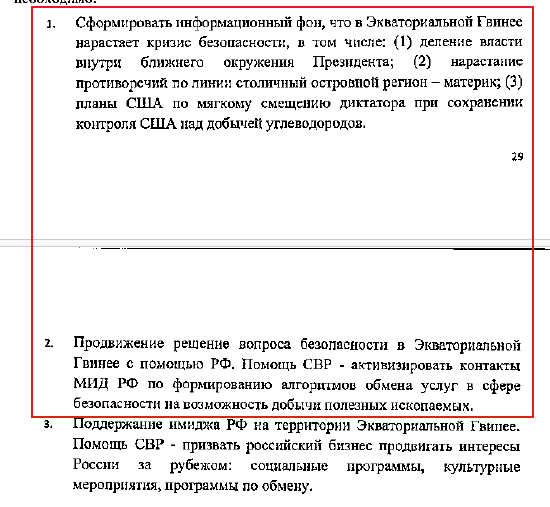 Similar other cases are spotted in the documents. Africa Politology does not only promote a good image of Russia but it undermines target countries’ reputation and image to narrow choices and appear as the solutions of problems. In Equatorial Guinea, the strategy calls for fostering “a climate of increasing insecurity,” pointing to internal power struggles, regional tensions and even the circulation of claims about alleged U.S. plans to unseat the country’s leadership. The objective is not necessarily to invent crises from scratch, but to magnify existing fractures so it becomes the dominant belief. Russia can then come and offer the unique solution left: a Russian partnership and security solution.