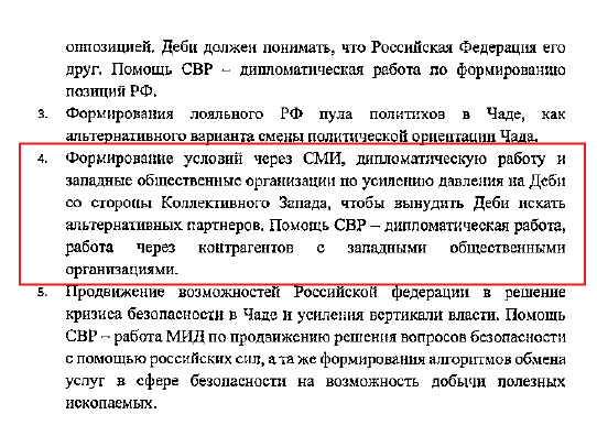 For Chad’s leader, Mahamat Idriss Déby, the documents propose creating conditions — through media activity, diplomatic engagement and work with Western public organizations — that would increase Western pressure on his government. The goal is counterintuitive: not to shield him from criticism, but to intensify it, nudging him to seek alternative partnerships when relations with Washington or Paris fray. The strategy is very clear “Deby must understand that the Russian Federation is his friend”