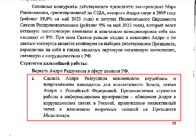 To pull Mr. Rajoelina back into its orbit, the proposed strategy is stark. Make him “maximally inconvenient and unacceptable” to the West by linking him publicly to Russia. The information operation strategy contemplates accusations of corrupt ties with Moscow, with the expectation that Western governments might respond with secondary sanctions against him. Africa Politology believed at the time Rajoelina would have no choice but to turn to Russia. In addition, the Company recommended replacing the Ambassador at the time with a SVR officer more acquainted with the art of influence and recruitment than a career diplomat. He would have to persuade the president that his political survival depended on Moscow’s backing.