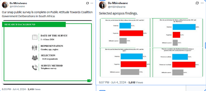 The goal is also to discourage any ANC-DA coalition. 9477 reports Mbalula and Mbindwane’s interests into polls conducted by Africa Politology ahead of elections. We could find them online, posted by Mbindwane on his social media account.