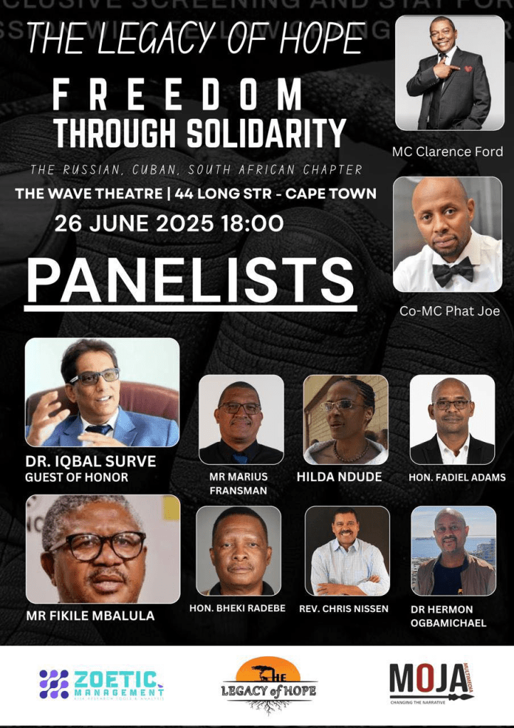 “It was a melting pot period”, explains Marius Fransman, founder of the People’s Movement for Change, in an interview given for a South African documentary on African freedom movements and decolonisation. “The Russian, the Soviet countries were committed to their cause but equally that the South Africa and Angolan causes were protected”. Gathering African National Congress (ANC) and other political leaders, activists and figures of the South Africa’s freedom movements, Legacy of Hope, directed by Harry Hofmeyer, traces back Africa’s liberation struggles and the historical support of countries like the Soviet Union, China and Cuba to freedom movements. Released in May 2025, the first episode of a 6-part film is intended to mark the 80th anniversary of Victory Day. Marius Fransman, also one of the co-producers, added that “2025 marked the 70 years of the Freedom Charter gathering that ultimately led to the Constitution of a Democratic Republic of South Africa. It also takes into account that 2026 is the 50 year anniversary of the Soweto Uprisings”. On the official website, “Legacy of Hope: Freedom through Solidarity – the Russia, Cuban, South African chapter” is released for the anniversary of the African National Congress. An anecdotal detail which appears in the account of a secret meeting taking place in Johannesburg.