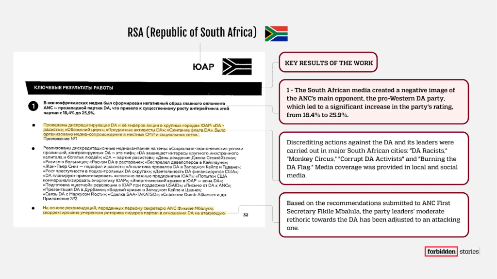 The South African operations were led by Maksim Sokolov, identified in documents obtained by Forbidden Stories as “9477.” A 2022 survey by the Russian newspaper Novye Izvestia ranked him among the country’s leading “political technologists” in the Northern West Federal District.