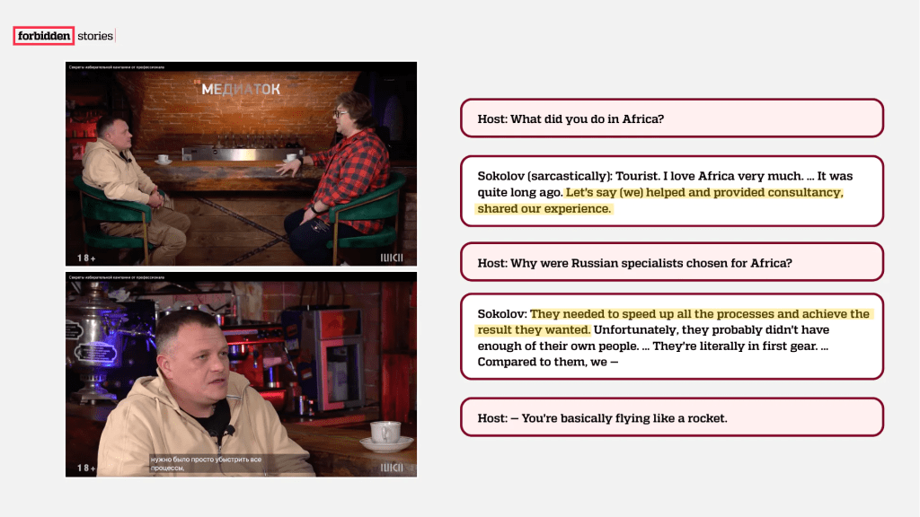 His team, he said, had “helped and provided consultancy,” arguing that Russian specialists were needed to accelerate local political operations: “They’re literally in first gear,” he remarked, before the interviewer interjected, “You’re flying like a rocket.” Sokolov did answer calls from Forbidden Stories.