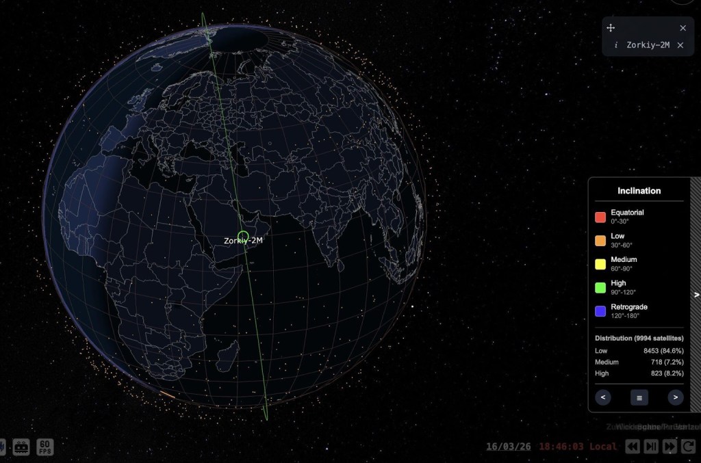 Pour vérifier cette affirmation, INPACT a consulté les données de suivi publiques du satellite Zorkiy-2M, ID NORAD : 57177. Les données orbitales montrent que le satellite est passé directement au-dessus du centre pétrolier de Fujairah — non pas une fois, mais plusieurs fois dans la fenêtre concernée. La géométrie de visualisation dans l’image publiée correspond également à une capture en ligne droite.