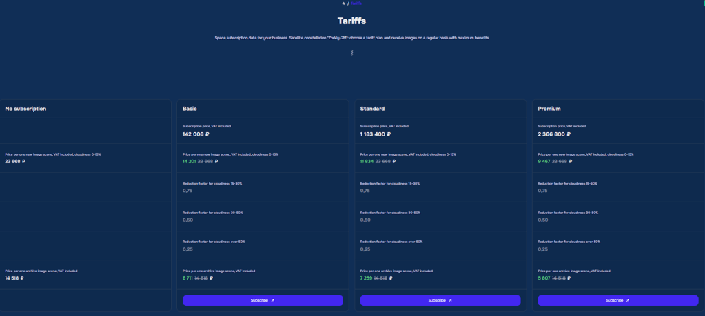 Planche tarifaire du fournisseur russe d’imagerie satellite grand public Sputnik et de la plateforme de commande des images. Source1 / Source2