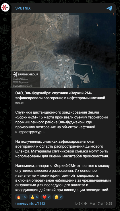 La société a partagé des images prises par son satellite Zorkiy-2M montrant des incendies et un énorme panache dans la zone pétrolière de Fujairah — un centre clé de stockage de pétrole sur la côte Est des Émirats arabes unis, qui aurait été touché dans un contexte d’escalade régionale en cours.