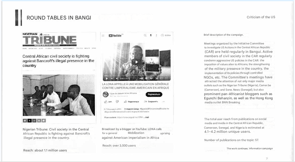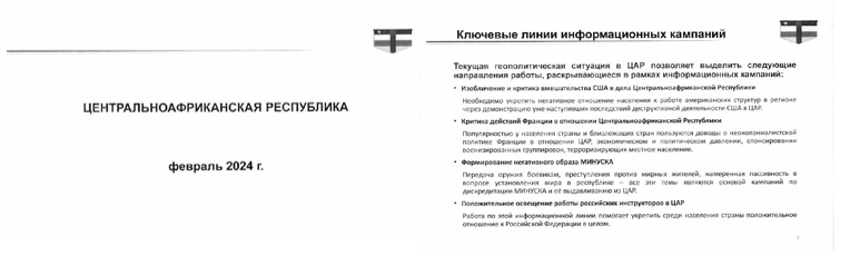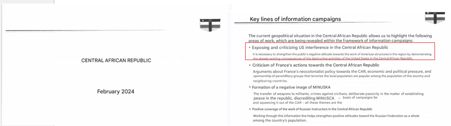 This is not by chance. Politology’s strategy in CAR is very clear for February 2024: “Strengthening the public negative’s attitude towards the work of American Structure in the region demonstrating the already existing consequences of the destructive activities of the United States in the Central African Republic” per internal Politology documents obtained by The Continent.
