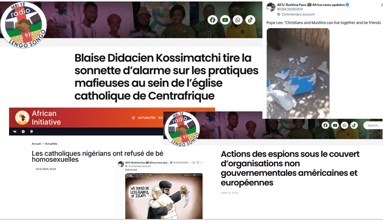 Christian NGOs like World Vision are accused of financing CIA operations by providing logistics support and receiving information in exchange. Radio Lengo Songo -created and managed by Politology and now under the de facto control of Russia’s Foreign Intelligence Service – promotes a campaign from Galaxy Panafricaine in 2026 about alleged corruption within the Catholic Church in CAR. Galaxy Panafricaine accuses new priests of embezzlement and living sinful double lives. GRU-affiliated media Africa Initiative further exacerbates the rift caused by the Fiducia Supplicans in Africa. Some allegedly Russian controlled online accounts dedicated to the Politology-supported Alliance of the Sahelian States are also reposting aggressive messages referring to inter-religious peace proclaimed by Pope Leo XIV during his 2026 African Tour.