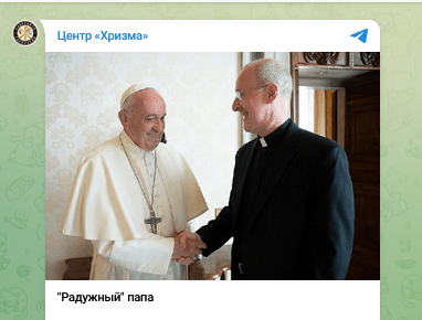 It is useful to place this post in context. It originated on the Telegram channel “Christma Center,” which, just six months earlier, had branded Pope Francis the “Rainbow Pope”—a pointed reference to what it portrayed as his “Satanist LGBT pastoral” policy. The channel’s output consistently seeks to construct a stark, Manichean narrative.