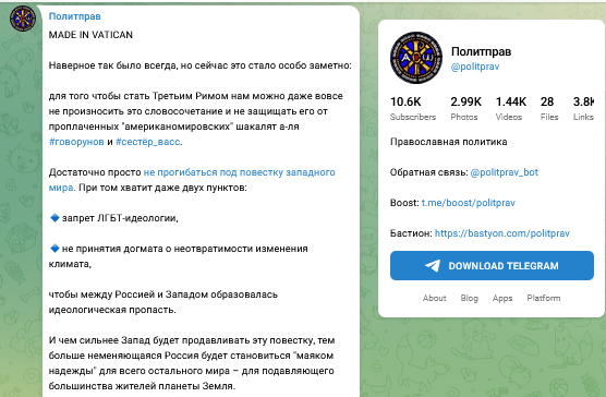 Discussions among well-followed Russian political bloggers also push the narrative seen in CAR that the Western intelligence services are behind the Vatican and the Catholic Church: “To become the Third Rome, […] it is enough not to bow to the agenda of the Western world. […] The next question is: how do they intend to destroy Orthodoxy under these conditions? First, by keeping some of our hierarchs and administrators at the foot of the papal throne. It is through this means that Western intelligence services will manipulate those who fall into their trap. […] Furthermore, they will put pressure on all other Orthodox countries to renounce the Russian Church and condemn it. […] And if we do nothing, this will introduce into our Church a “Trojan horse” manufactured in the Vatican.”