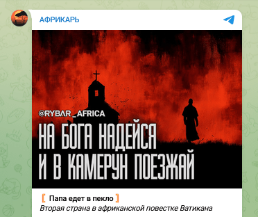 On March 16th, the Russian MoD (and ex Wagner) affiliated Rybar Africa channel published a post called “The Pope Goes to Hell” in response to Pope Leo XIV’s visit to Cameroon. The message concludes with a thinly veiled warning, echoing recurring influence narratives that portray France as manipulating Cameroonian elites while insinuating collusion between the Holy See and Western powers. It frames the visit not as a diplomatic or religious engagement, but as a potential trigger point:
