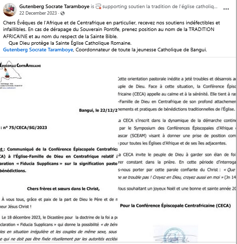 On 22nd of December 2023, Socrate Gutenberg Taramboye, leader of the CAR Catholic Youth, published on Facebook a letter from the Central African Episcopal Conference signed by Cleric Kongbo Gbassinga rejecting the Fiducia Supplicans, the controversial 2023 Vatican declaration allowing informal, non-sacramental blessings of same-sex couples. CAR religious authorities are not alone in this movement: the African continent rejects in mass what is seen as unacceptable and disconnected from African traditional values. Russia capitalizes on this traditionalist sentiment and uses it to turn sympathetic people against a Vatican that they perceive as too “degenerate”.