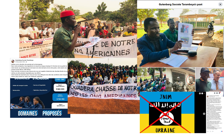 Since 2024, Politology’s approach in Africa has been to leverage civil society organisations to campaign against France and the U.S in African countries. One organisation stands out, the Committee of Initiatives for Control of the United States’ Actions in the Central African Republic (CICAUSAC), emerging in early 2024 and led by Socrate Taramboye.